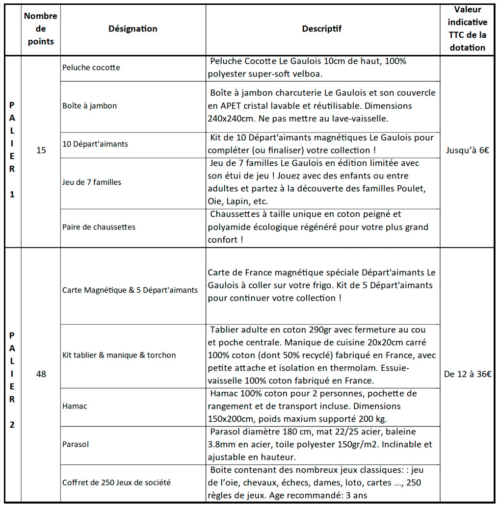 • Palier 1 : cumuler 15 points soit 15€ d’achat de produits Le Gaulois porteurs de l’offre