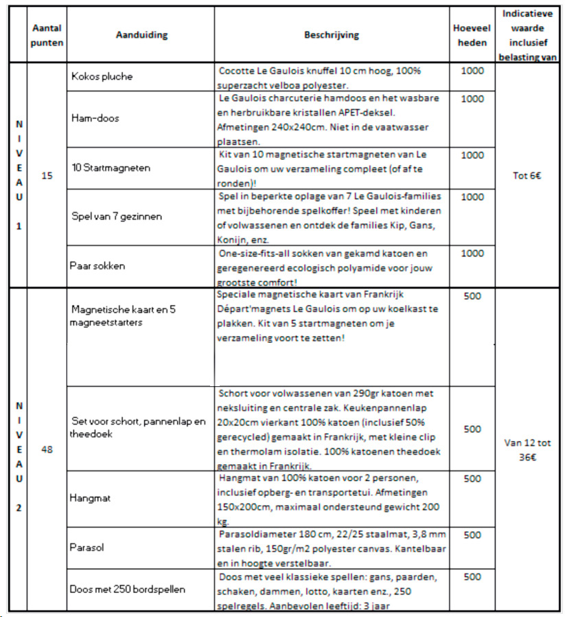 • Niveau 2: 48 punten verzamelen, d.w.z. € 48 aan aankopen van Le Gaulois-producten waarop de aanbieding van toepassing is.